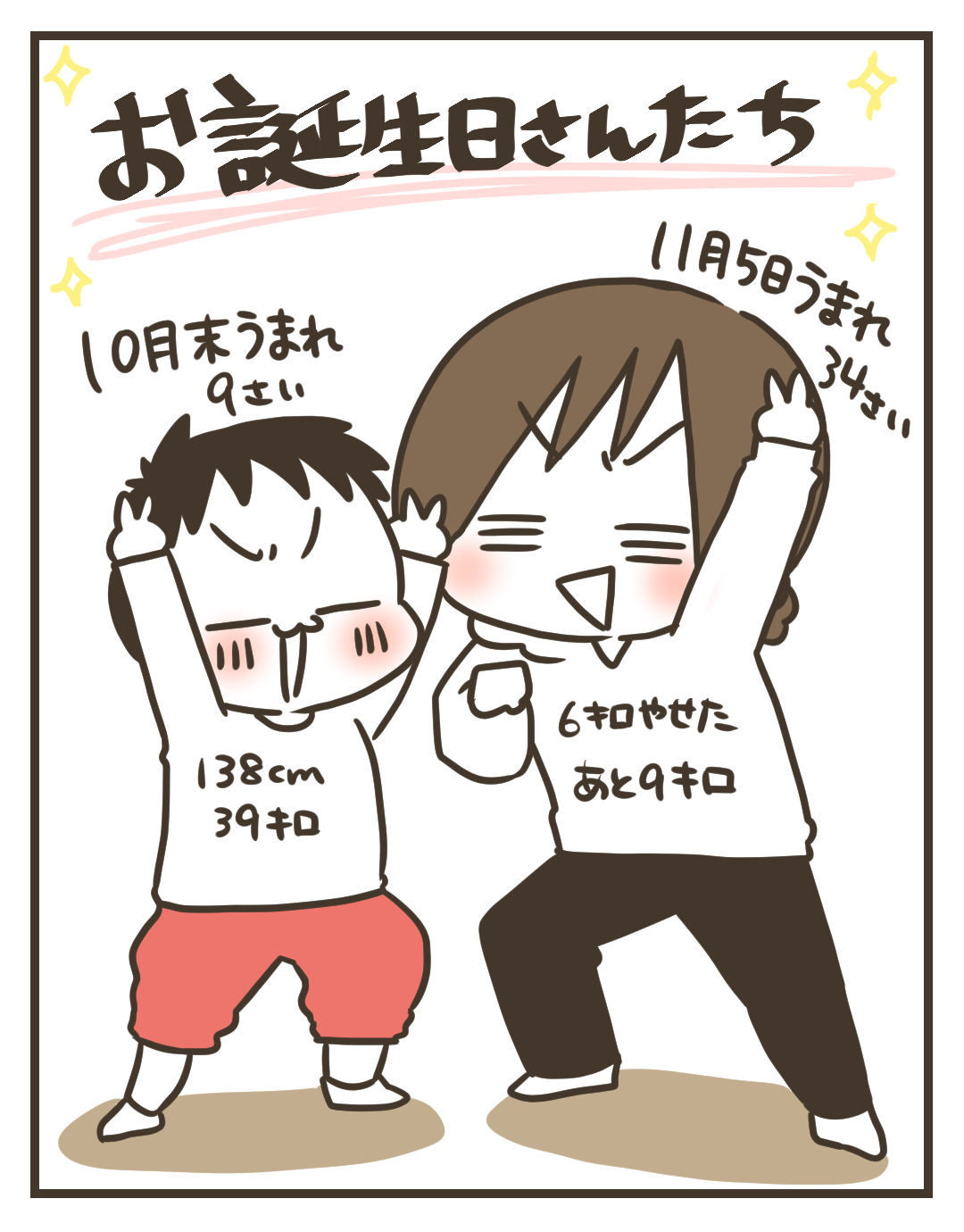 お誕生日さんたち 皆様こんにちは!なおたろーです!いつもありがとうございます!今日は一枚イラスト!お誕生日でした!私は今日です!34歳になりました!こさぶちゃんは10月末で9歳になりました。9歳男子の平均身長は130センチ、平均体重は28キロらしいのですが(なおたろー調べ)こさぶちゃ ... 2025/11/05 続きを読む