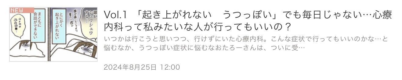 オンライン心療内科のお話、掲載されております! 皆様こんにちは!なおたろーです! いつもありがとうございます! 今回はお知らせです。 ウーマンエキサイトさんで以前描いたオンライン心療内科のお話を掲載していただきました〜! こちらから読めます★ ↓ ↓ 「起き上がれない うつっぽい」でも毎日じゃない…心 ... 2024/08/25 続きを読む